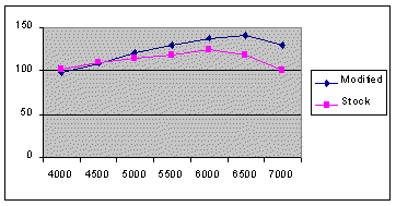 It seems like everyone likes to quote HP numbers that look good. Sometimes they have dyno slips to prove it, but usually they have "guesstimates". Others don't even really guess. The most common guesses I see are "stock it's 125hp, header adds 20hp, chip adds 15hp, underdrive adds 5hp, intake mods add 10hp, 160deg thermostat adds 3hp . . ." Let's see, that means this 125hp motor now makes . . . 178hp - 42% (53hp) more than stock with just bolt-ons??? I doubt it. There's one trick speed shops can use in advertising is publishing the biggest gap in the HP curve. Because HP gains with a given displacement generally means spinning the motor higher, the RPM where peak HP is is also higher. Take a look at the graph below :